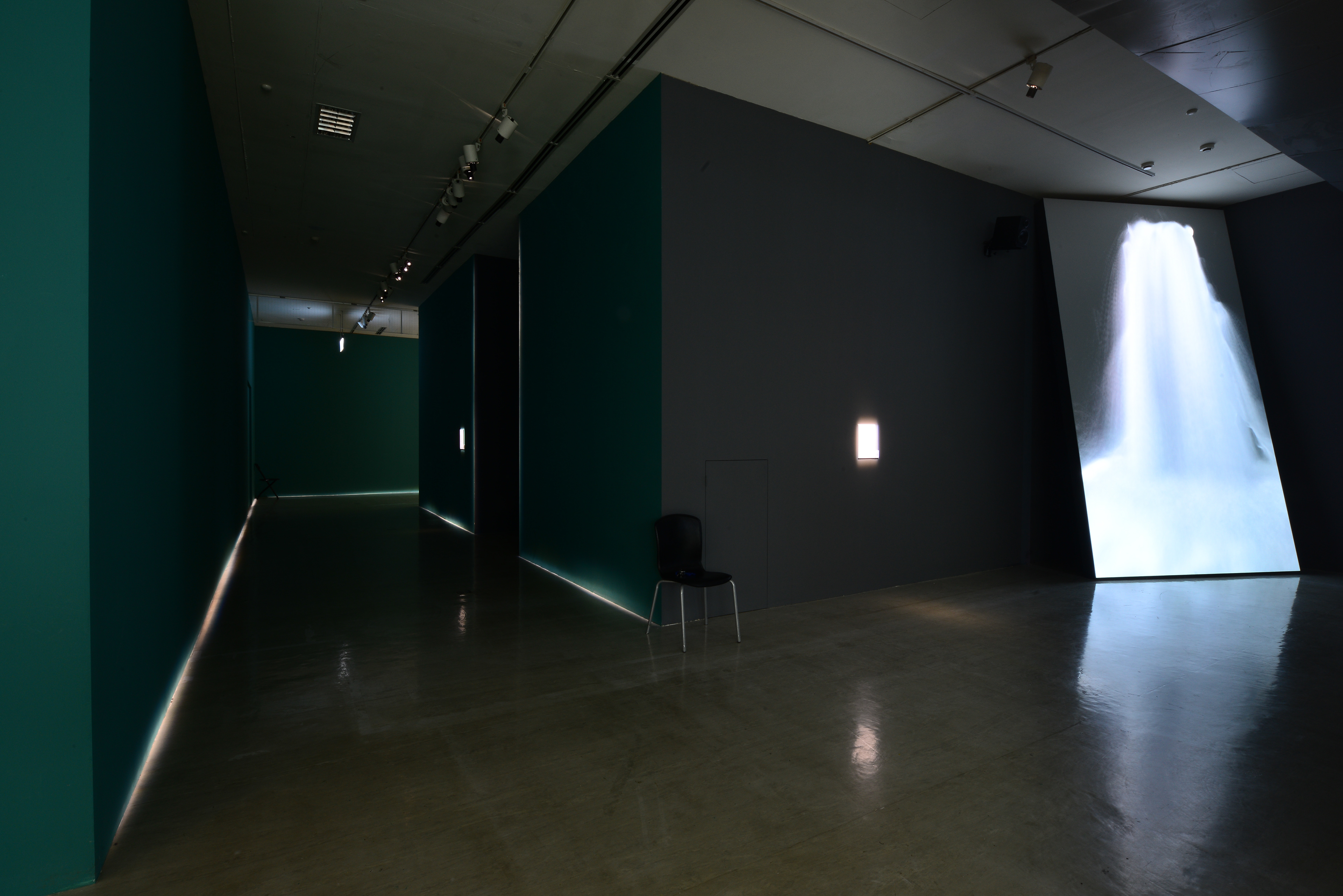 廖祈羽兩件雙頻道錄像作品〈忘憂公園〉(Sanssouci Park)與〈河〉(River)同樣充滿意識流動的環境再現,是以早期臺灣相館慣以手繪的浪漫美景作為棚拍布景,布景中可見畫師們想像中的歐式建築和街景,但這些景物街道並不真實存在。影像作品中,男女主角在手繪布景前追尋遠方想像和回憶,誠如王聖閎所言,「影像僭越了現實,讀來頗為類近後現代理論中常見的論調,但廖祈羽的錄像並沒有停留在這上頭打轉,而是具體探問著:人們與圖像∕影像之間的曖昧糾纏,究竟是圍繞在何種感性或理性基礎上建構的?」[5]藝術家也在展場中放置了布景和路邊常見的公園椅及路燈,在簡潔冷冽的展場中,日常物件的出現也增添幾許荒誕奇想,不禁讓人回想起盧梭畫中童話敘事般的超現實世界。